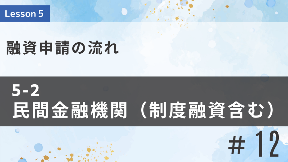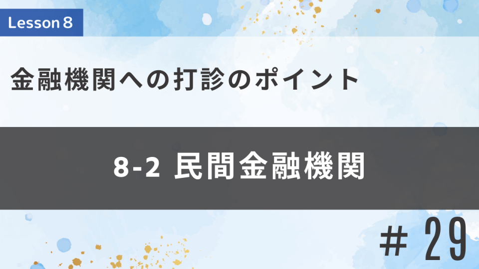 「8-2 金融機関への打診のポイント 民間金融機関」では、民間金融機関に事前相談行う際のポイントと日本政策金融公庫とは異なる部分を中心に解説します。 民間の金融機関は資金確保まで時間がかかりがちであるため、イレギュラーにも対応できるようにしましょう。 動画の内容 0:01:11 金融機関への確認内容 0:06:22 打診の内容について(相談経緯) 0:08:02 民間金融機関へ提出する事業概要書 0:13:19 打診の内容について(一覧)
