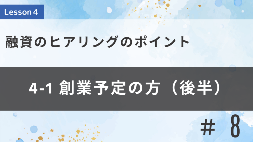 「4-1 創業予定の方(後半)」では、これから創業予定の融資申請を支援する際にヒアリングすべきポイントを具体的に解説しております。 以下の6~9のヒアリングポイントを順にみてまいりましょう。 6.融資確保の希望時期 7.自己資金 8.借入 9.支払い遅延の有無 動画の内容 0:00:54 6.融資確保の希望時期 0:05:53 7.自己資金 0:14:55 8.借入 0:19:07 9.支払い遅延の有無