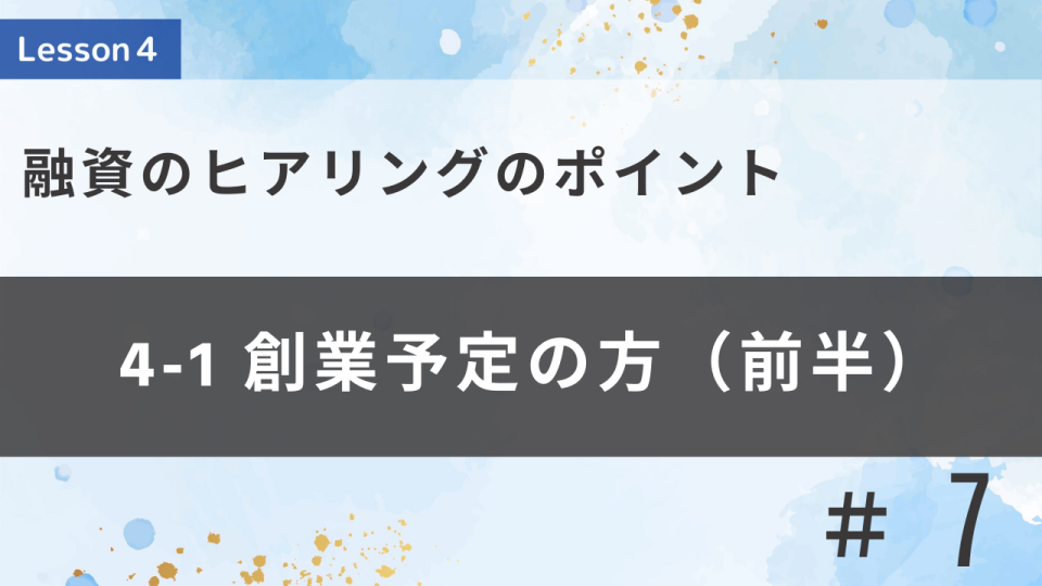 「4-1 創業予定の方(前半)」では、これから創業予定の融資申請を支援する際にヒアリングすべきポイントを具体的に解説しております。 以下の1~5のヒアリングポイントを順にみてまいりましょう。 1.これまでの借入の経験 2.事業概要 3.経験 4.創業動機 5.融資希望金額と内訳 動画の内容 0:00:55 ヒアリングについて(概要) 0:02:03 1.これまでの借入の経験 0:07:21 2.事業概要 0:11:19 …