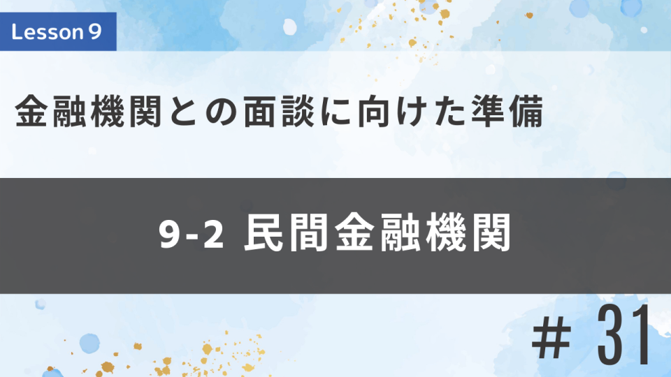 「9-2 面談対策のポイント 民間金融機関」では、民間金融機関日本政策金融公庫での面談に向けてどのような準備を行えばいいのかについて解説します。 日本政策金融公庫と異なり信用保証協会も関係するため、審査内容の違いと準備のポイントについて確認していきましょう。 動画の内容 0:00:56 民間金融機関の面談の位置づけ 0:05:34 信用保証協会との面談の流れ 0:08:45 信用保証協会との面談に向けて準備しておくポイント