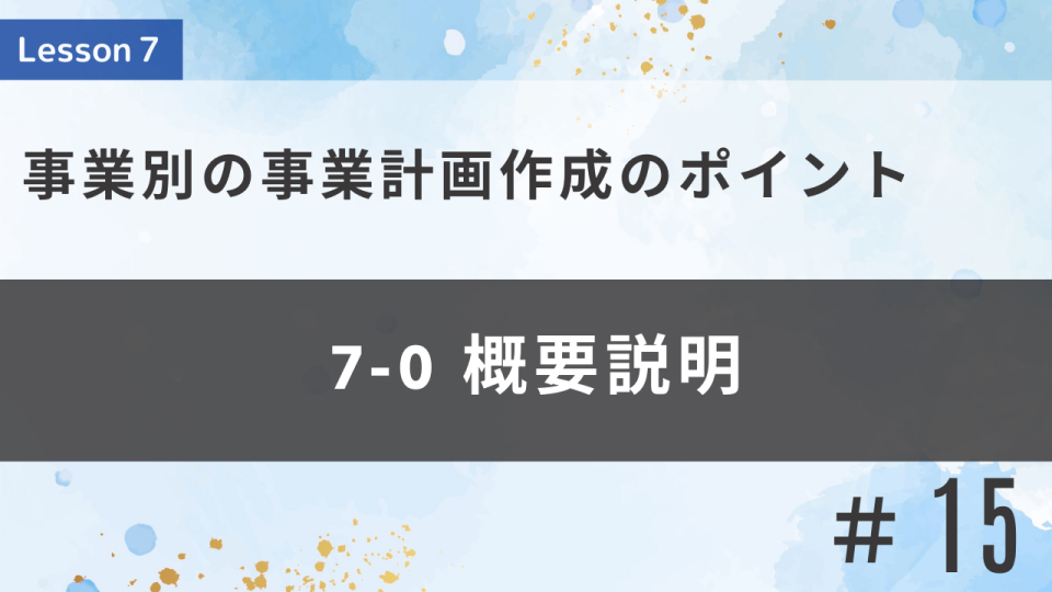 「7-0 概要説明」では、具体例に入る前に、収支計画表は何のために重要な資料なのかをご説明しております。 7-1から事業別に事業計画作成のポイントを解説してまいります。 動画の内容 0:00:00 「返済計画を含む 月次の収支計画表」を作成するにあたって