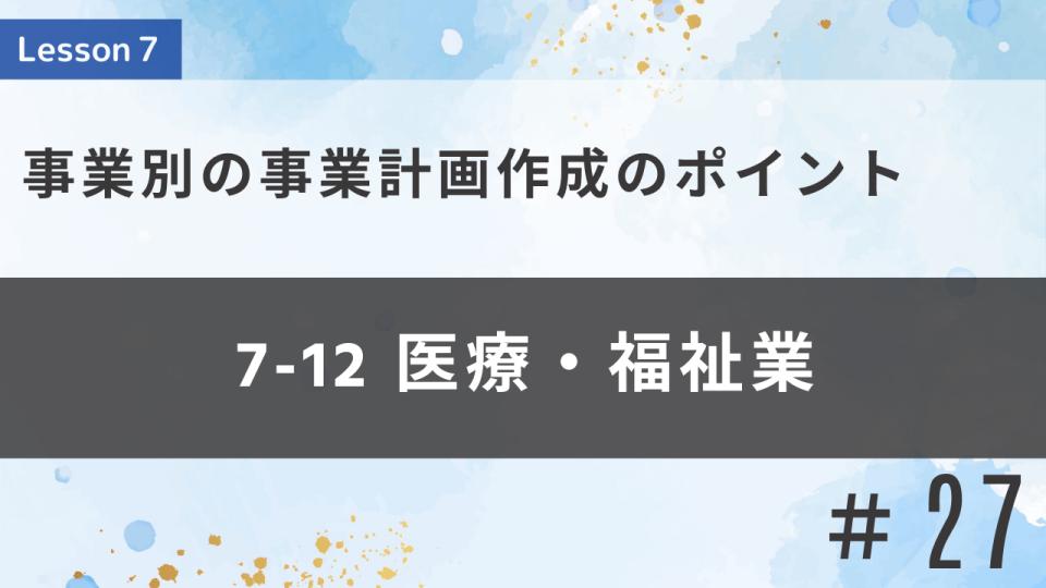 「7-12 事業別の事業計画作成のポイント 医療・福祉業」では、福祉業での実例をご紹介します。 事業経験がないFC契約での創業にあたり、設備資金のため日本政策金融公庫より1,000万円の満額融資が可決しました。 動画の内容 0:01:42 医療・福祉業~概要~ 0:06:10 実際の収支計画表