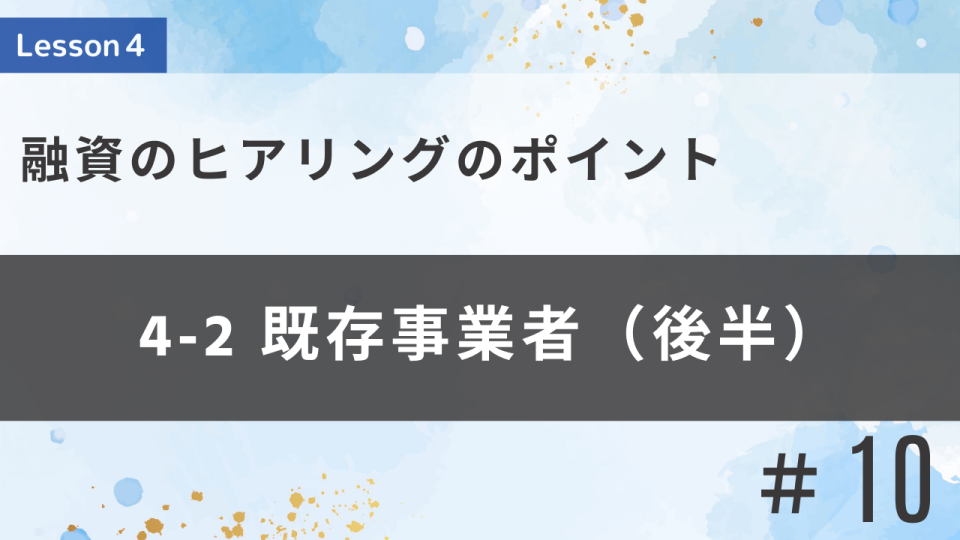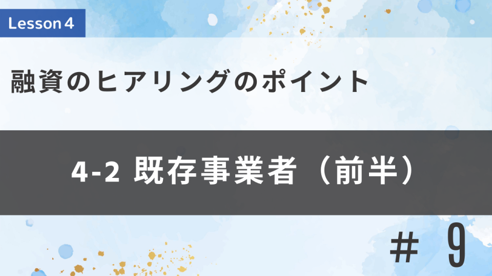 「4-2 既存事業者(後半)」では、すでにご事業をされている方の融資申請を支援する際にヒアリングすべきポイントを具体的に解説しております。以下の5~9のポイントを順にみてまいりましょう。 5.融資確保の希望時期 6.手元資金 7.借入 8.支払い遅延 9.融資の可能性と金額 動画の内容 0:29:14 5.融資確保の希望時期 0:07:11 6.手元資金 0:15:03 7.借入 0:17:57 8.支払い遅延 0:24:55 9.融資の可能性と金額