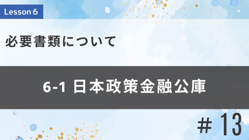 「6-1 日本政策金融公庫」では、日本政策金融公庫から求められる資料を、法人・個人事業それぞれ整理しております。 また、求められる資料のうち、創業計画書・企業概要書のサンプルを用いて、作成のポイントを解説しております。 動画の内容 0:01:16 法人、個人それぞれで求められる資料 0:09:49 日本政策金融公庫の「創業計画書」 0:20:44 事業者様のご状況によっては必要となる書類 0:23:28 プラスaのアピール資料