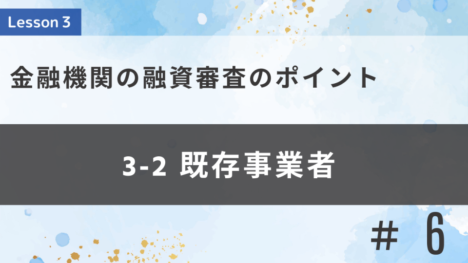「3-2 既存事業者」では、起業から既に2期以上経過している既存事業者が融資を受けるうえで審査される4つのポイントを金融機関目線で詳しく解説を行います。 ・事業概要(法人個人、事業内容) ・決算内容(B/S、P/L) ・事業の拡大の見通し ・信用情報や借入状況 動画の内容 0:00:27 既存事業者の融資審査における4つのポイント(概要) 0:01:08 ①事業概要 0:04:32 ②決算内容(B/S、P/L) 0:25:23 ③信用情報や借り入れ状況