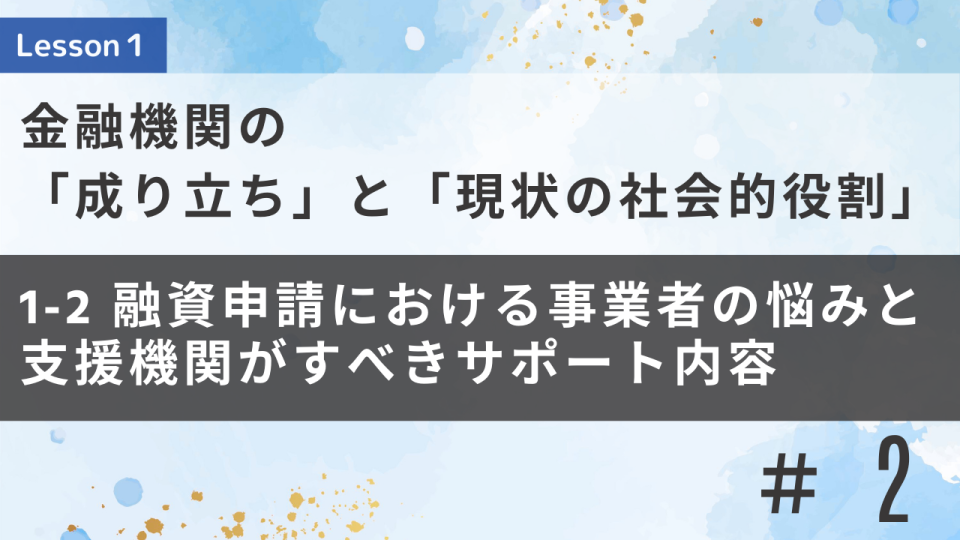 「1-2 融資申請における事業者の悩みと支援機関がすべきサポート内容」では、事業者が融資申請を行う際に抱く主な悩みについての解説と、その悩みの解消に向けて支援機関としてどのようにサポートを行うべきかについて解説します。 「事業者」「金融機関」「支援機関」の関係性を整理したうえで、支援機関が行うべき役割を確認していきましょう。 動画の内容 0:00:38 「事業者」「金融機関」「支援機関」の関係性 0:02:30 融資申請における事業者の悩みと支援機関がすべきサポート内容 0:11:32 「成長過程」の事業者に対する支援機関の役割 0:16:33 「成長後」の事業者に対する…