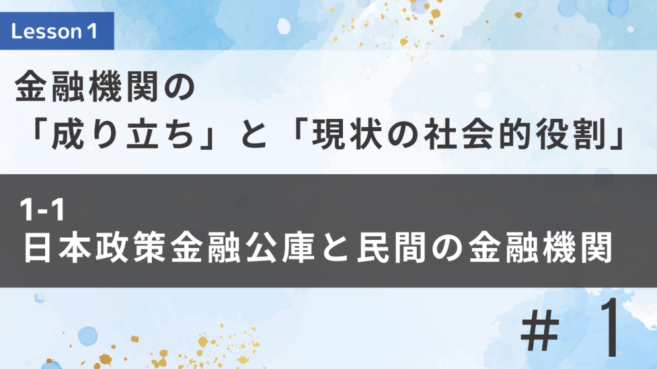 「1-1 日本政策金融公庫と民間の金融機関」では、公的機関である日本政策金融公庫と民間の金融機関のそれぞれの成り立ち、役割や違いについて解説いたします。民間の金融機関の区分や信用保証協会との関係にも触れ、民間の金融機関における融資の構造についても把握を行います。 動画の内容 0:01:14 日本政策金融公庫の成り立ち 0:03:35 日本政策金融公庫役割と使命 0:07:42 日本政策金融公庫の特徴と今後の取り組み 0:12:48 民間金融機関の区分と特徴 0:16:53 信用保証協会の位置づけ 0:19:23 信用保証協会のしくみ 0:20:46 プロパー融資とは